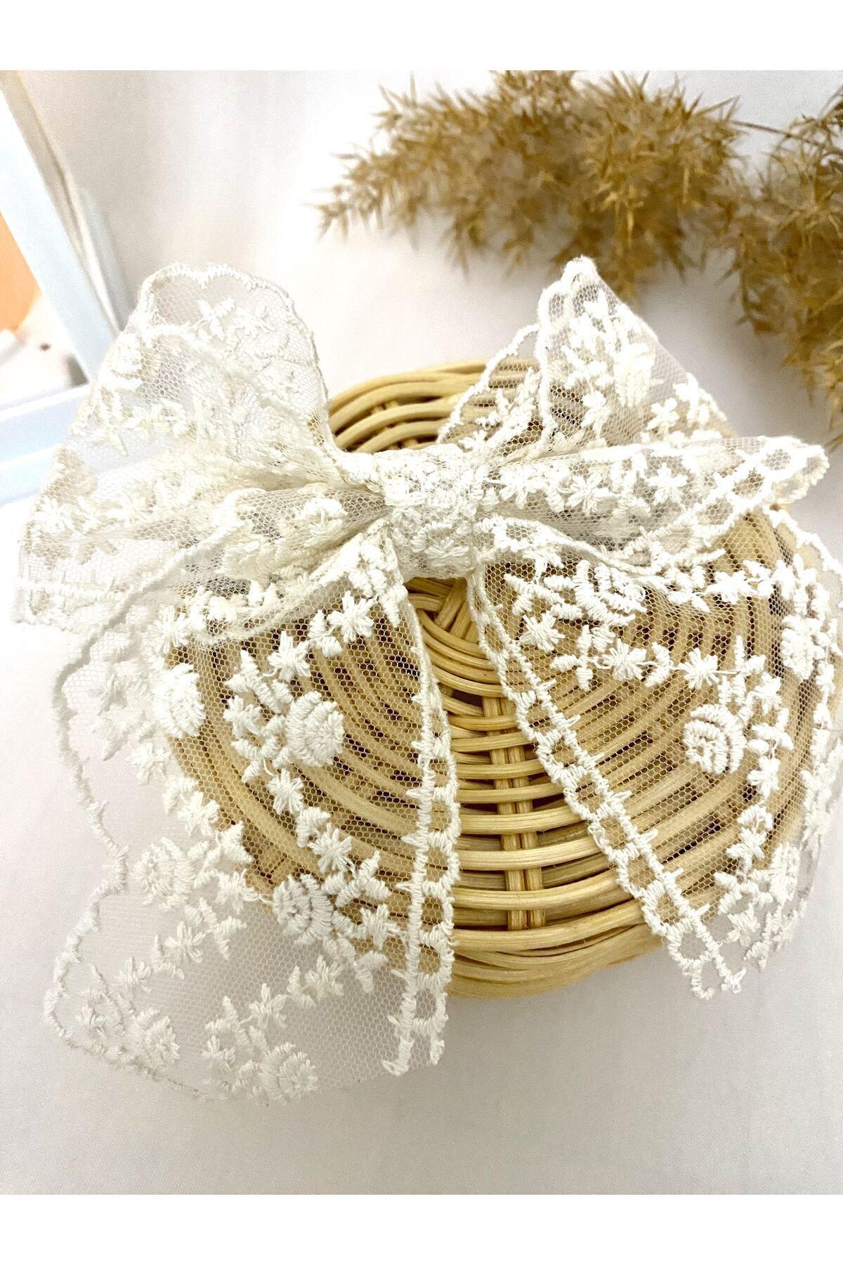 Ekru Transparan Dantel Otomatik Fiyonk El Yapımı Yetişkin Genç Kız Çocuk Klipsli Toka Hediye