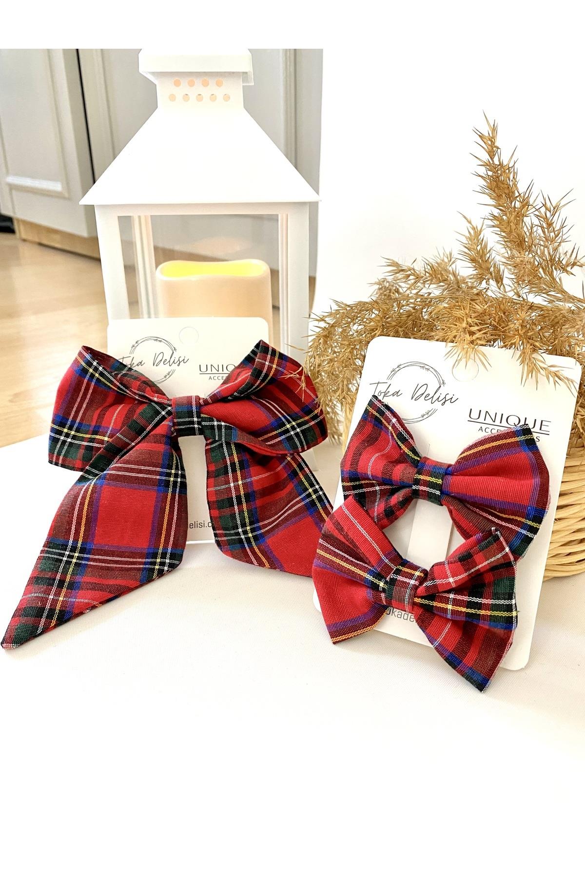 El Yapımı Anne Kız Kırmızı Ekose Yılbaşı Fiyonk Toka, Özel Kırmızı Yılbaşı Tokası