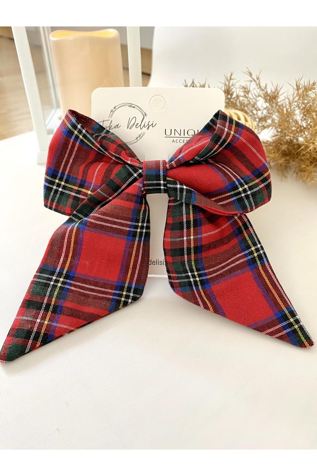 El Yapımı Kırmızı Ekoseli Yeni Model Fiyonk Toka, Kırmızı Yılbaşı Tokası, Sevgililer Günü Kadin Toka