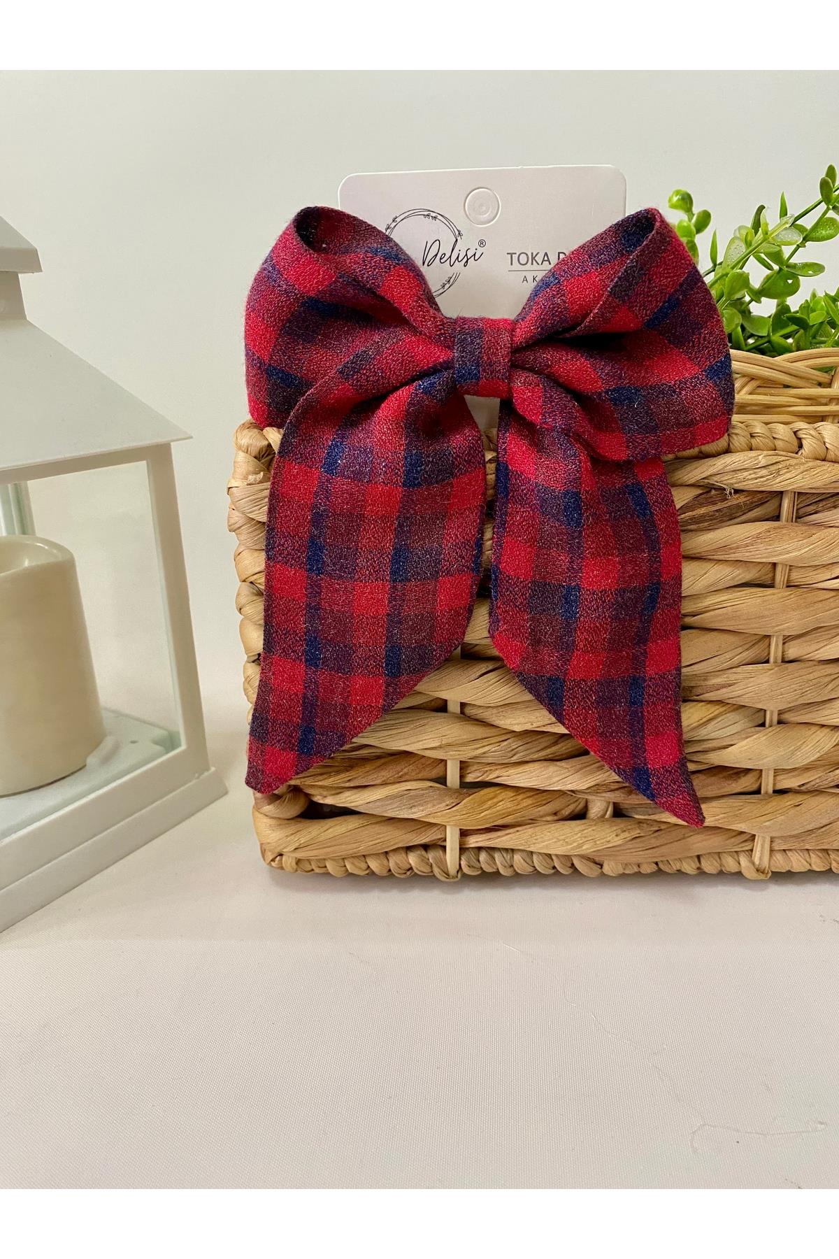 El Yapımı Kırmızı Lacivert Kareli Model Fiyonk Toka, Kırmızı Yılbaşı Toka, Sevgililer Gün Kadin Toka