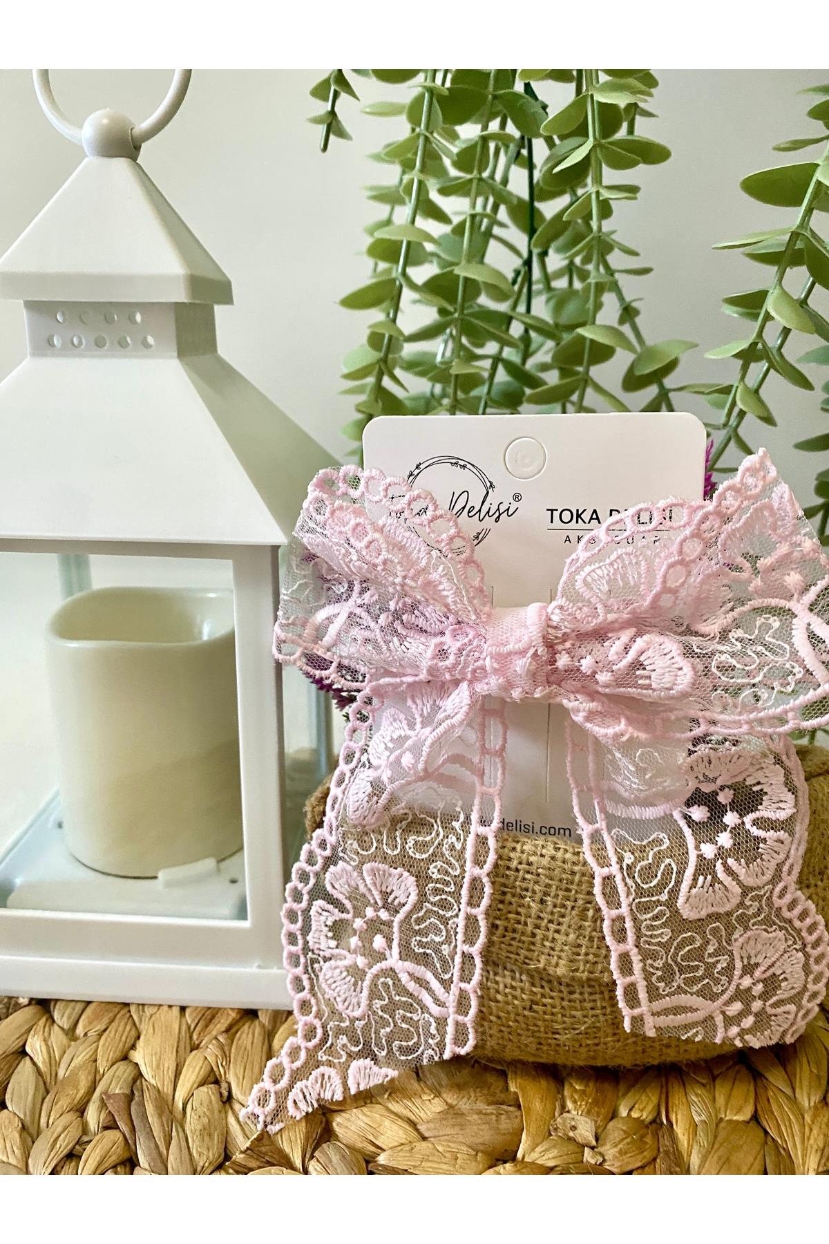El Yapımı Romantik Açık Pembe Dantel Fiyonk Toka, Otomatik Klipsli Saç Tokası, Kadin Toka