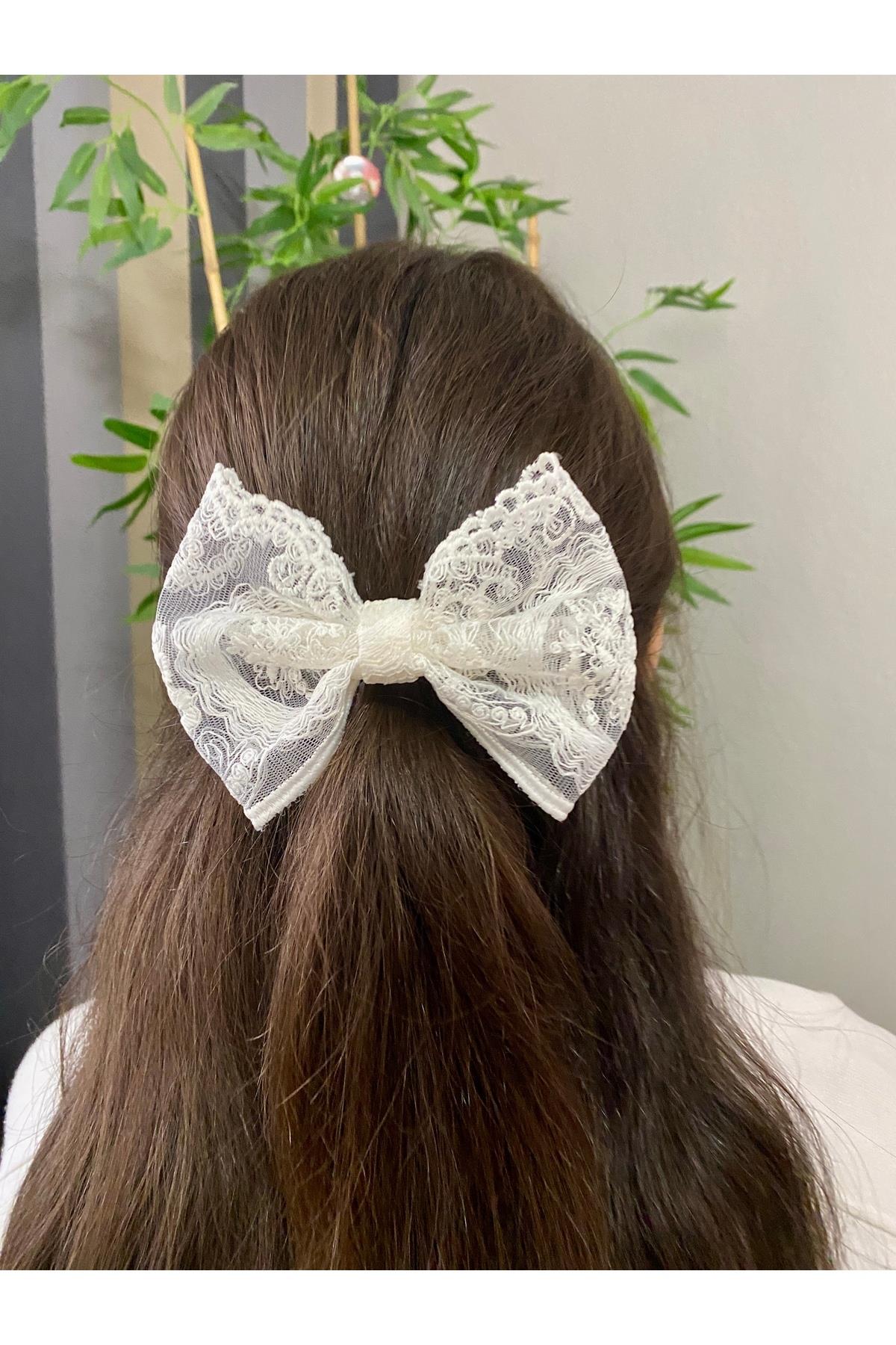 El Yapımı Romantik Beyaz Dantel Fiyonk Toka, Özel Tasarım Ekru Fiyonk Dantel Toka, 23 Nisan Toka