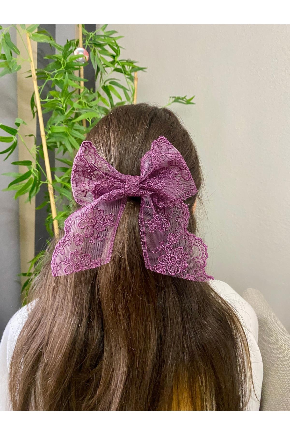 El Yapımı Romantik Dantel Mor Fiyonk Toka, Otomatik Klipsli Saç Tokası, Kadin Toka