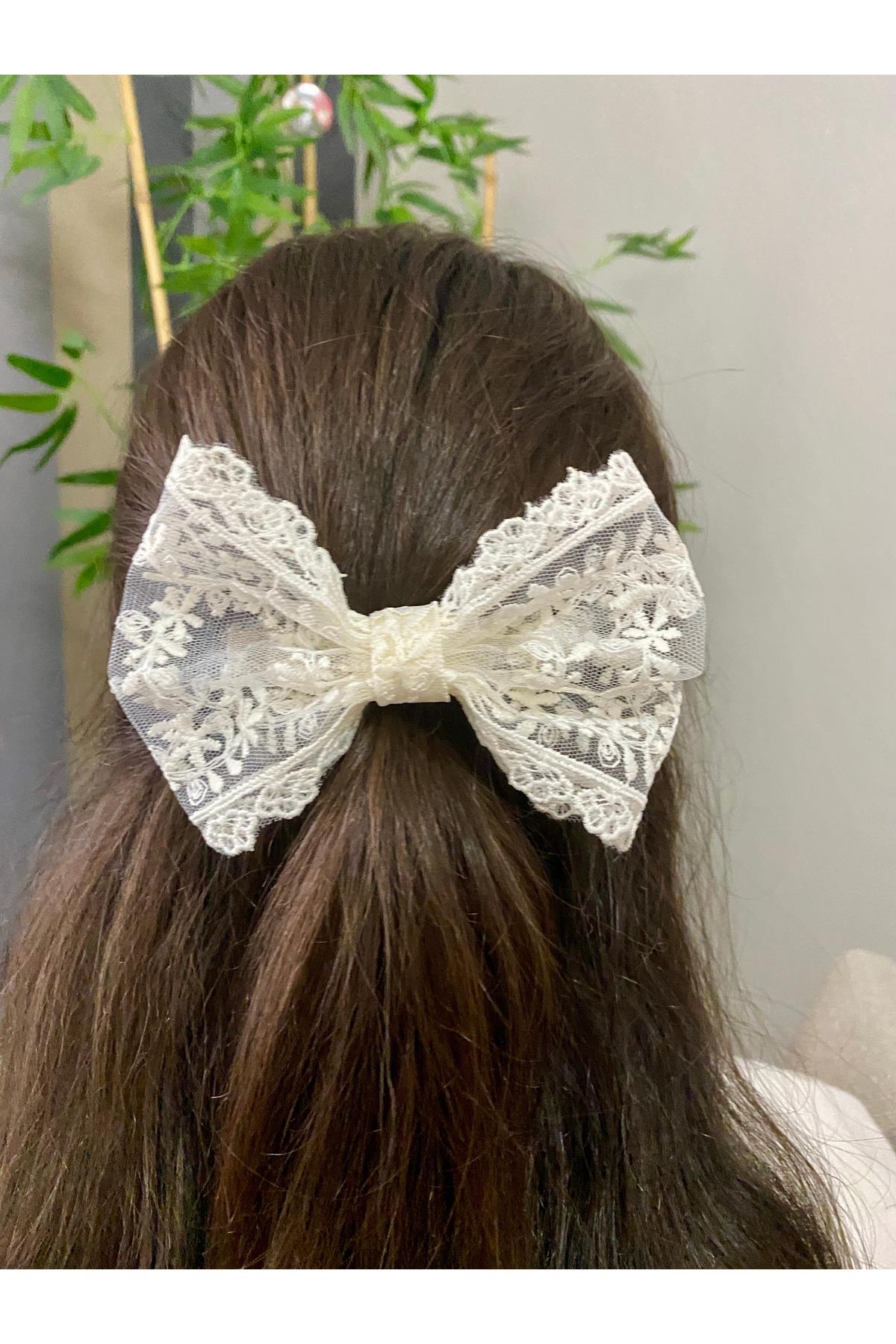 El Yapımı Romantik Ekru Dantel Fiyonk Toka, Özel Tasarım Ekru Fiyonk Dantel Toka, 23 Nisan Toka
