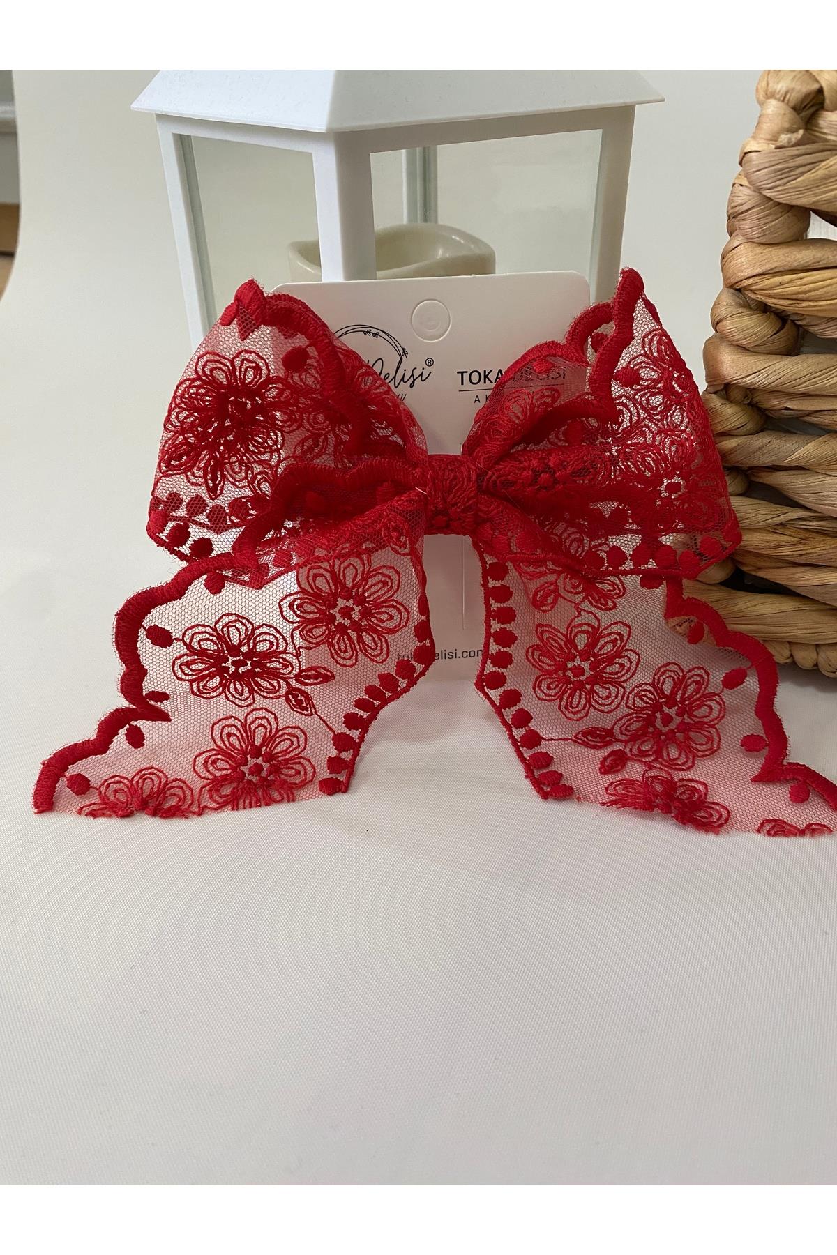 El Yapımı Romantik Kırmızı Dantel Fiyonk Toka, Otomatik Saç Tokası, Kadin Toka, 23 Nisan Toka