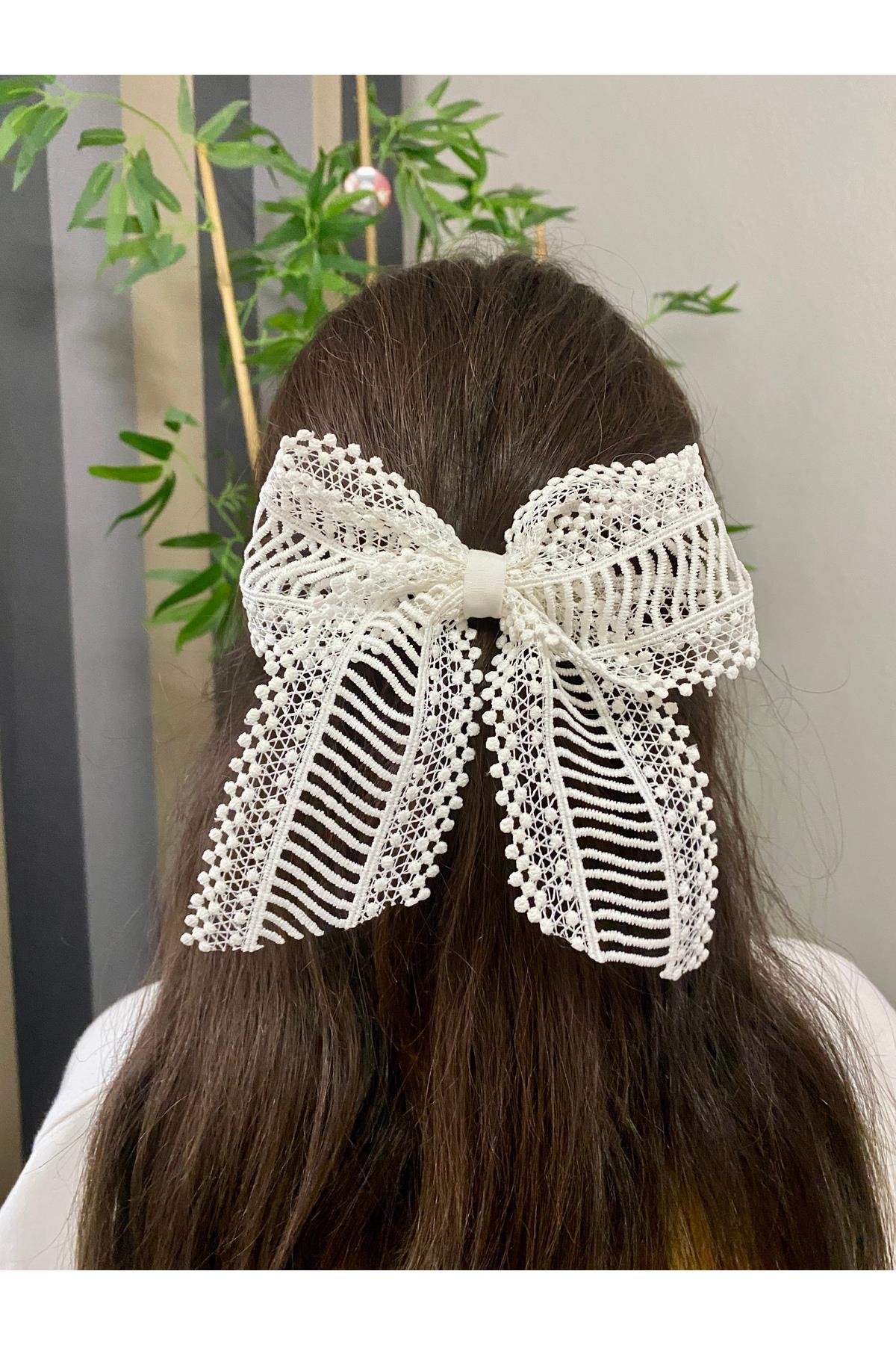 El Yapımı Romantik Kadın Beyaz Dantel Fiyonk Toka, Otomatik Klipsli Saç Tokası, Kadin Toka