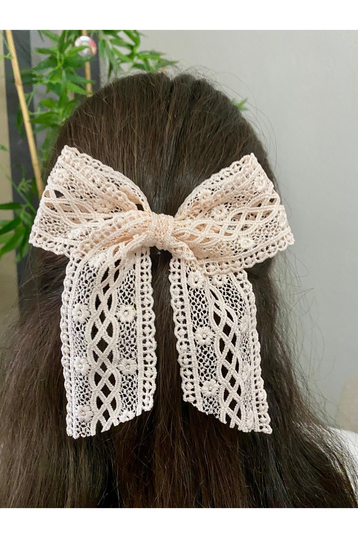 El Yapımı Romantik Kadın Somon Pembe Dantel Fiyonk Toka, Otomatik Klipsli Saç Tokası, Kadin Toka