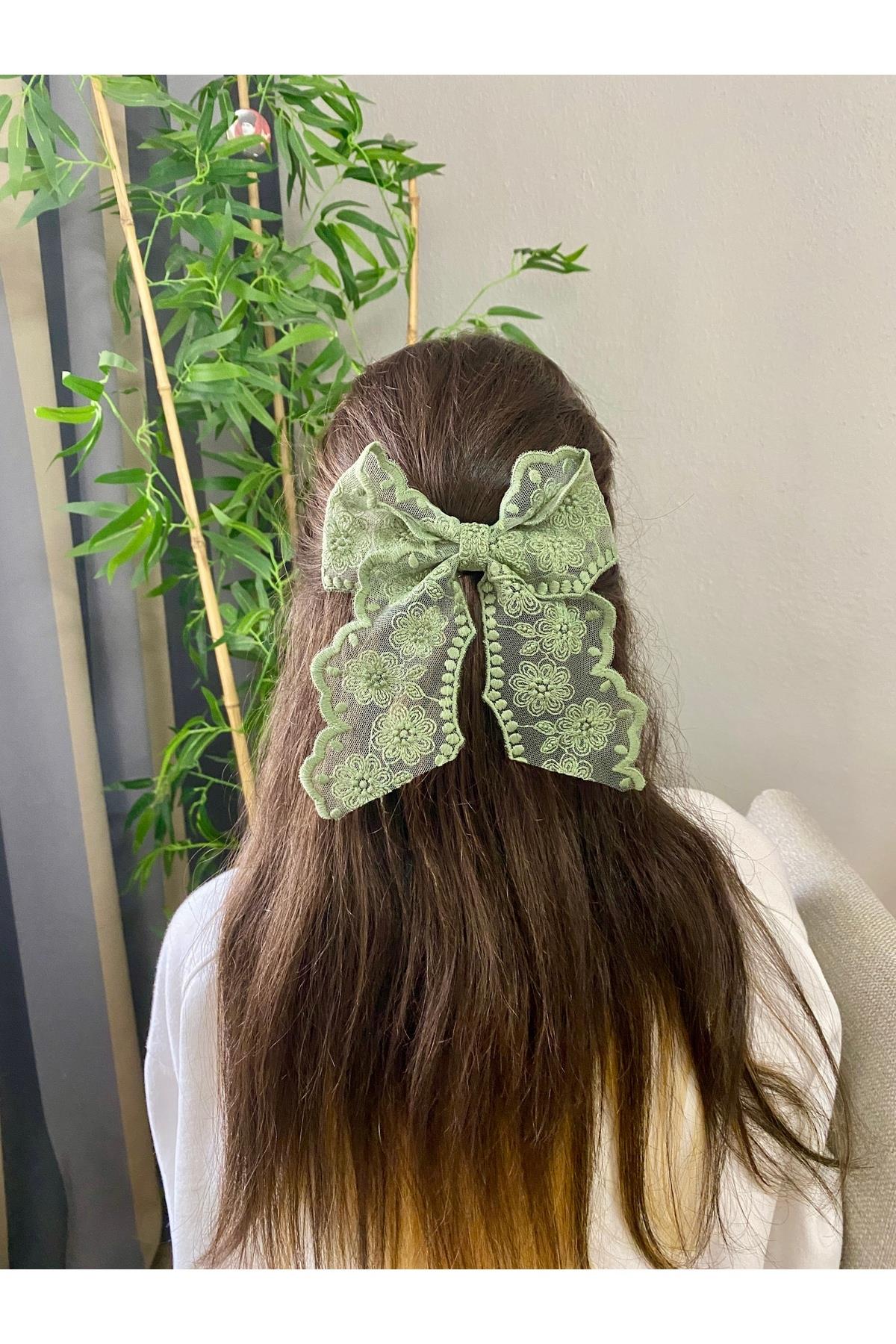 El Yapımı Yeşil Romantik Dantel Fiyonk Toka, Otomatik Klipsli Saç Tokası, Kadin Toka
