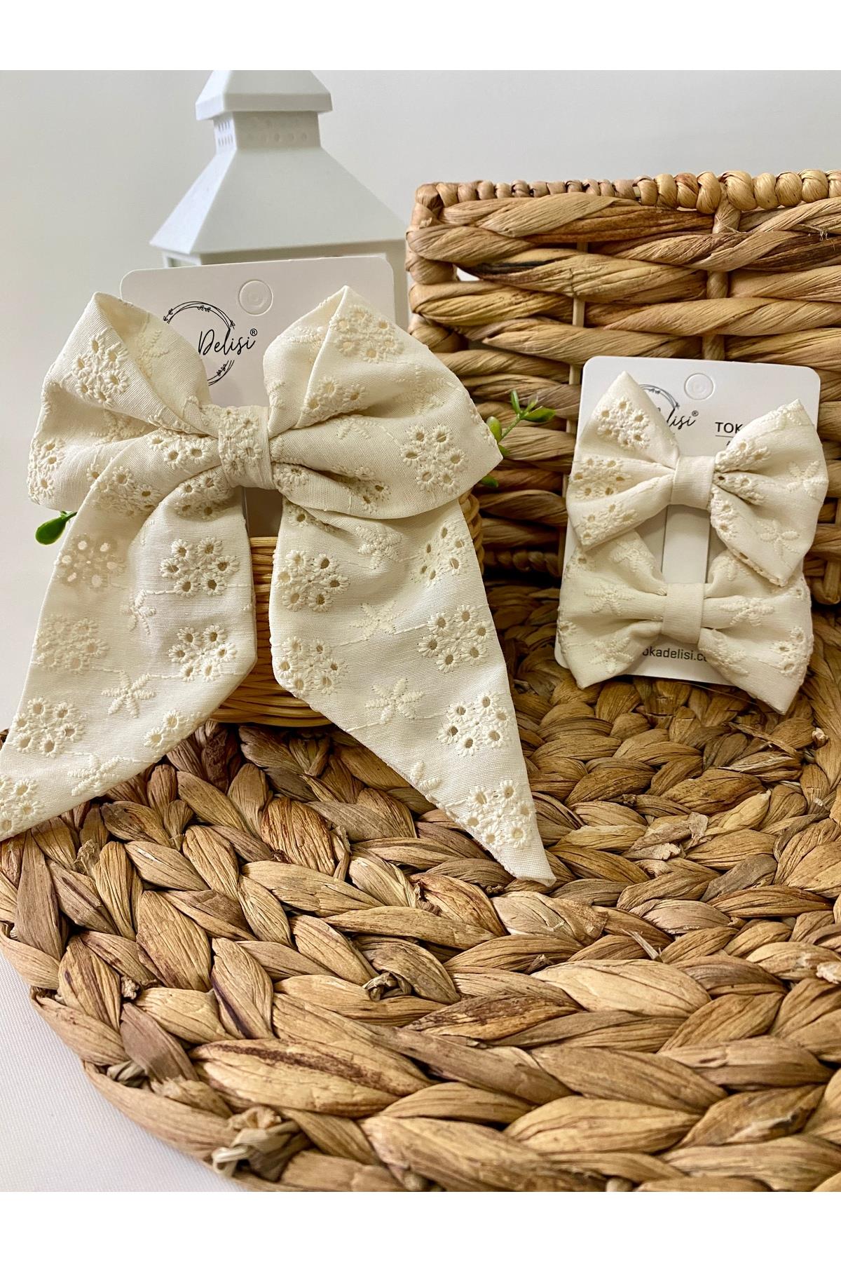 Krem Fisto El Yapımı Anne Kız Klasik Otomatik Fiyonk Toka Özel Tasarım, Kına Nikah Kadin Toka