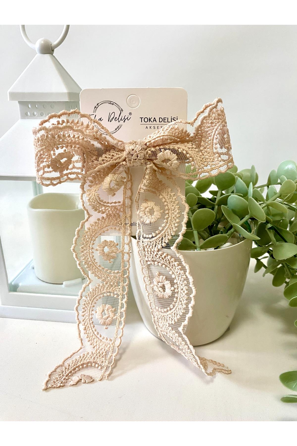 Toka Delisi tasarımı bu model, el yapımı olup mükemmel bir hediye seçeneğidir.; ; Satın alacağınız ürüne daha önce kimse tarafından sahip olunmadı.; ; İç açıcı tasarımıyla mutluluk verir.; ; Tasarımında Bursa'nın özel dantelleri ve kaliteli, kararma yapmayan french barrette otomatik 8 cm.; ; klipsli metal toka kullanılmıştır.; ; Ürün bebekler hariç her yaş grubu için uygundur.; ; Uzun kuyruklu fiyonk toka boyutları yaklaşık olarak 13x18 cm.; ; Çevreye duyarlı ve şık ambalajlama seçeneği ürüne değer katmaktadır.; ; Ürünün görüntüsü dantelin kendine özgü desenine göre farklılık gösterebilir.;