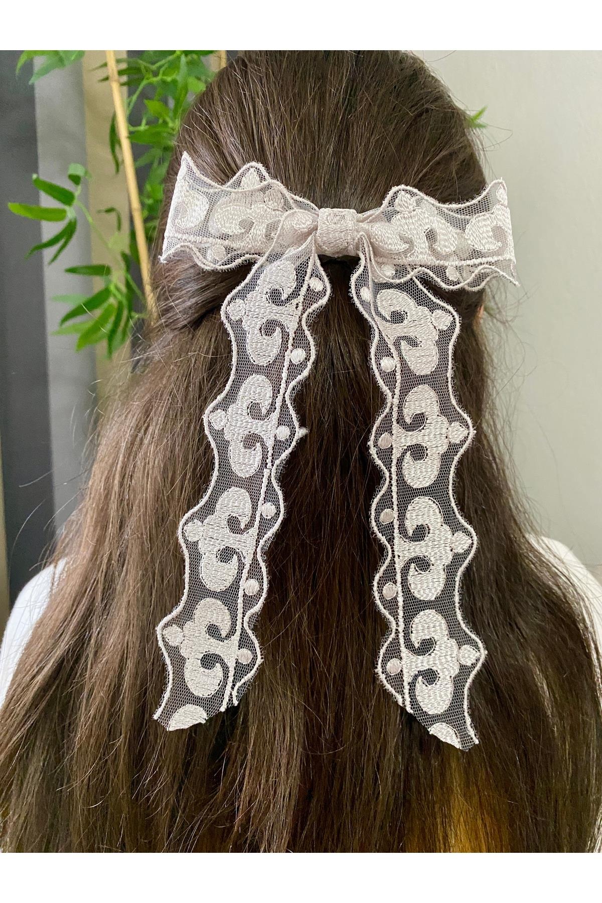 Romantik Uzun Kuyruk Gri Dantel Fiyonk Toka, El Yapımı, Kadın Otomatik Fiyonk Toka Hediyelik