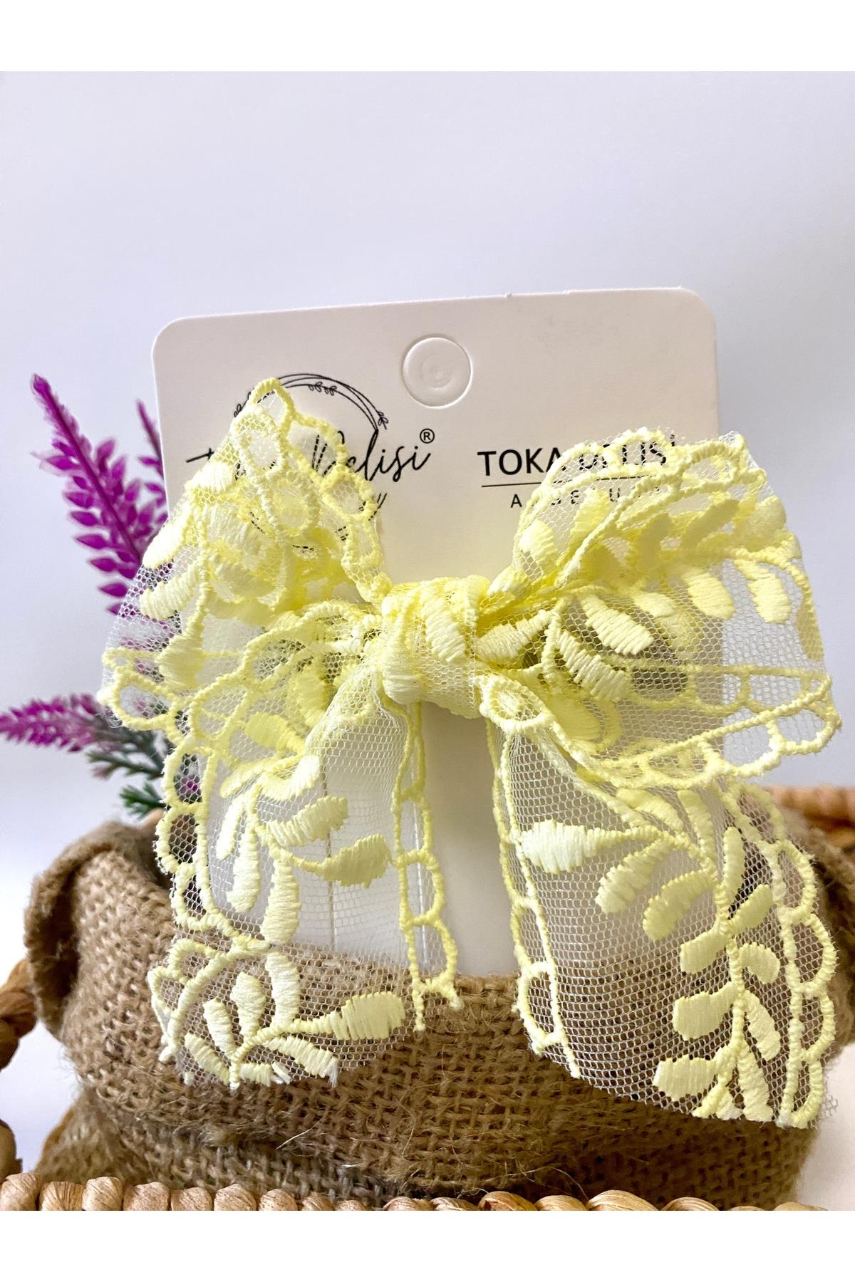 Yan Çocuk Tokası, Düz Renk Dantel Özel Seri Açık Sarı Fiyonk, El Yapımı Toka, Kiz Cocuk Toka
