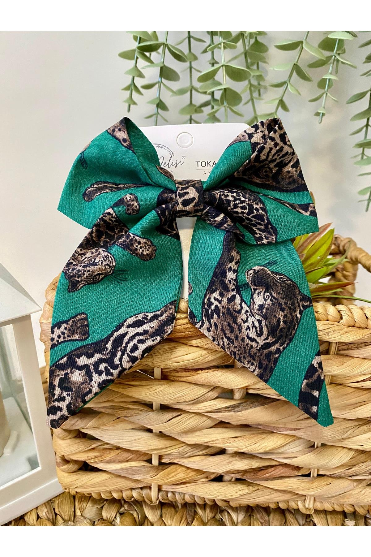 - Zümrüt yeşili rengindeki vahşi leopar deseniyle göz alıcı bir görünüm sunar.; - Otomatik fiyonk tasarımı sayesinde kolayca takılıp çıkarılabilir ve pratik kullanım sağlar.; - El yapımı olmasıyla her bir tokanın benzersiz ve özgün olduğunu garanti eder.; - Metal gövde ve kumaştan oluşan materyali ile dayanıklılığı artırırken şık bir dokunuş katmaktadır.; - Gençlerin enerjisine hitap eden tasarımıyla stil sahibi genç kadınların tercihi olur.; - Türkiye'de üretilmiş olup yerel üretimden gelen kaliteyi yansıtır.; - Polyester malzemesi sayesinde uzun süreli kullanım için idealdir ve kolay temizlenebilir özelliğiyle pratiklik kazandırır.; Ürün yaklaşık 13 cm.;
